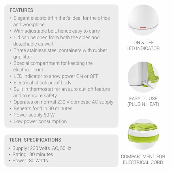 – The lunch boxes have features such as a wide belt for carrying, double-walled insulation to keep food hot for hours, and a thermostat for safety.