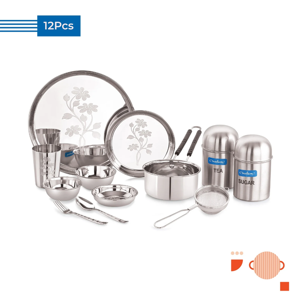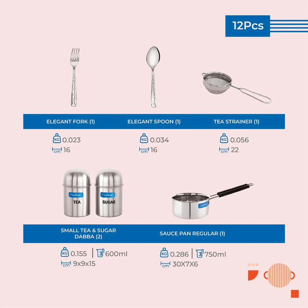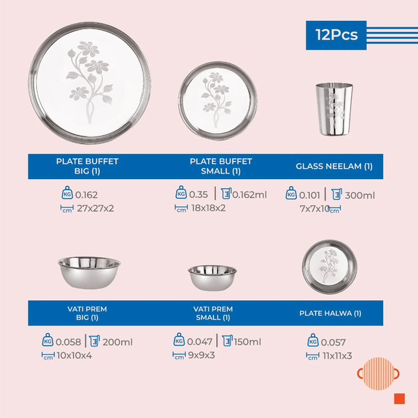 1 pcs big plate 1 pcs small plate 2 pcs vati 1 pcs glass 1 pcs halwa plate 1 pcs fork 1 pcs spoon 1 pcs tea strainer 2 pcs small tea and sugar dabba 1 pcs regular saucepan
