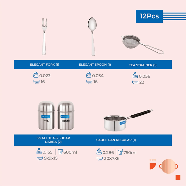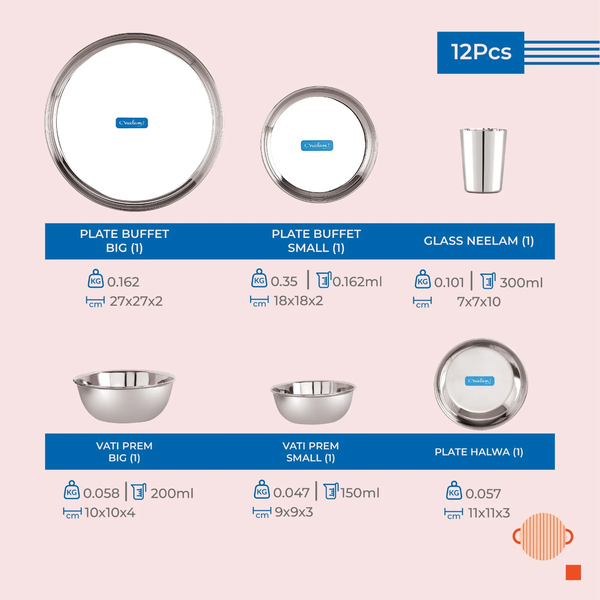 1 pcs big plate 1 pcs small plate 2 pcs vati 1 pcs glass 1 pcs halwa plate 1 pcs fork 1 pcs spoon 1 pcs tea strainer 2 pcs small tea and sugar dabba 1 pcs regular saucepan