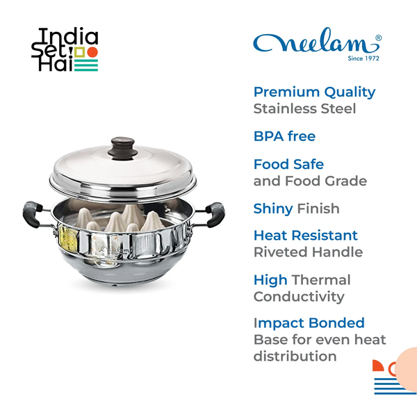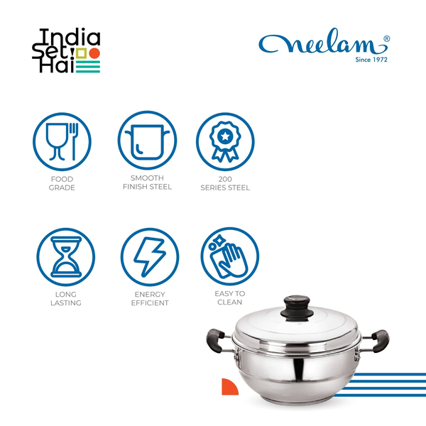 Introducing the Multi-Kadai: multi-purpose cooking essential. This high-quality stainless steel multi-kadai offers more than just traditional cooking. It comes with a cook and cook set, allowing you to prepare a variety of dishes such as Idlis, Dhoklas, Modaks, Bhakarwadi, vegetables, and more. This energy-efficient multi-kadai is professionally manufactured for long-lasting durability, featuring a riveted stay-cool ear handle. Cook anything that calls for a kadai with ease and style