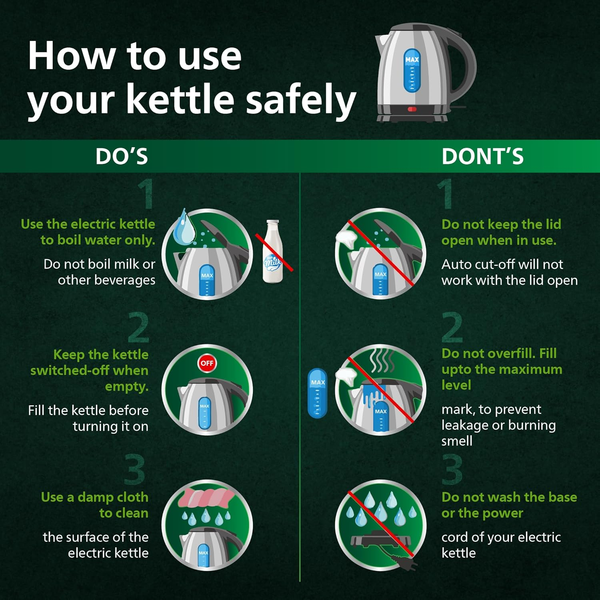 • Triple Safe Auto Cut Off : Strix controller three sensors for dry boiling, Over heating & Steam to ensure the kettle shuts of when water boils & does not start if no water is there in the kettle
