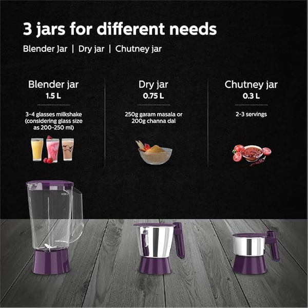 - 3 Jars: 1.5 L Blender Jar, 0.75 L Multipurpose jar,0.3 L chutney Jar