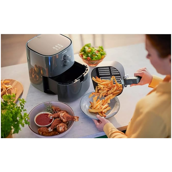 Great tasting fries with up to 90% less fat* thanks to Rapid Air technology! Philips brings the World’s leading Airfryer to everyone’s home. Enjoy healthy food that’s crispy on the outside and tender on the inside. The healthiest way to fry, bake & grill ! Little or no oil is needed to ensure perfect texture and delicious results! Unique design for tasty and low-fat cooking results. Fast and easy, manually-adjustable time and temperature control. With the reheat feature, enjoy your meal whenever you’re ready. Easy to clean and creates less smell than normal fryers. Comes with Automatic shut-off, Cool wall exterior, Ready Signal, Power-On Light, LED Display, Time control & temperature control and is dishwasher safe. With the Airfryer HD9200/70 you can fry, grill, roast and even bake, to make homemade food that you and your family love, everyday