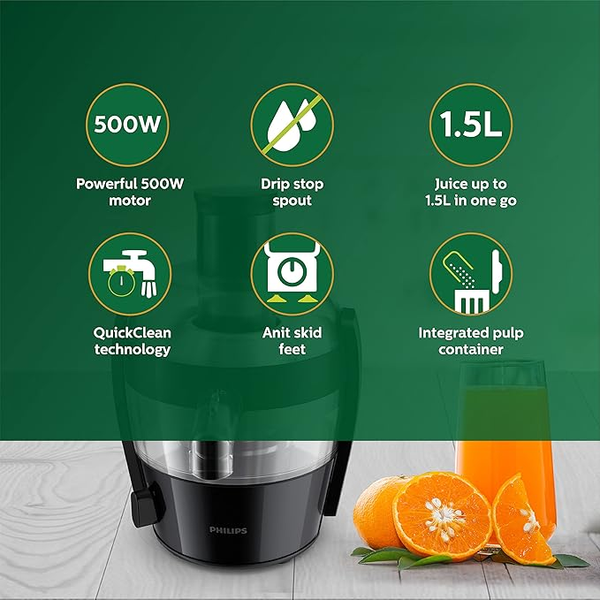 - Capacity: 1.5 liters, Power: 500 watts, Operating Voltage: 220-240 volts, Includes: Juicer, Pulp Container (1 litre) and Juice Jug (500 milliliter)