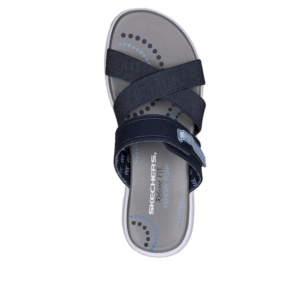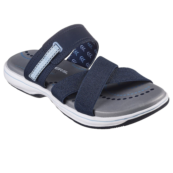 Slide into sporty comfort and style wearing Skechers Relaxed Fit : Bayshore – Take It Easy. This roomy vegan slide sandal features a crisscross strap stretch gore upper with an adjustable instep closure, and a Skechers Memory Foam comfort footbed.