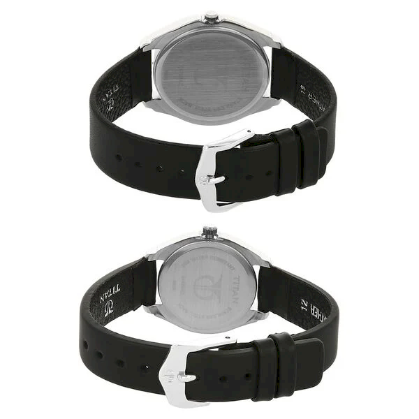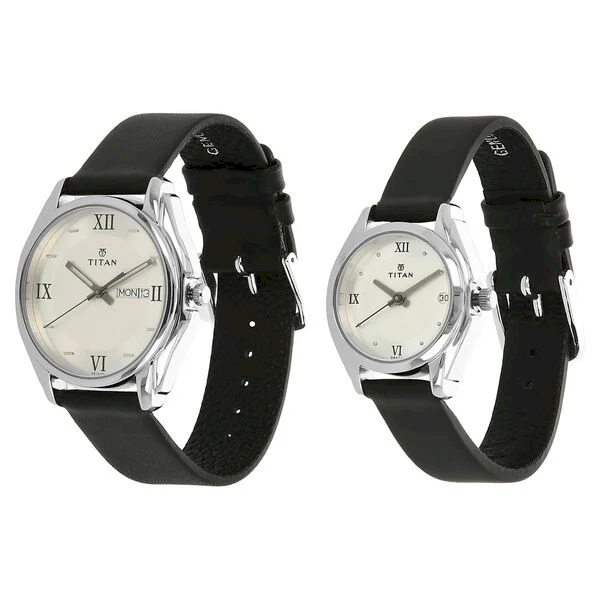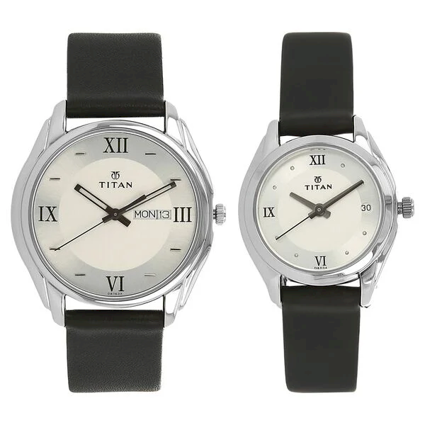 Titan Analog with Day and Date Silver Dial Leather Strap watch for Couple